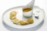 Carpaccio de Saint-Jacques, soufflés aux légumes et vinaigrette mangue passion